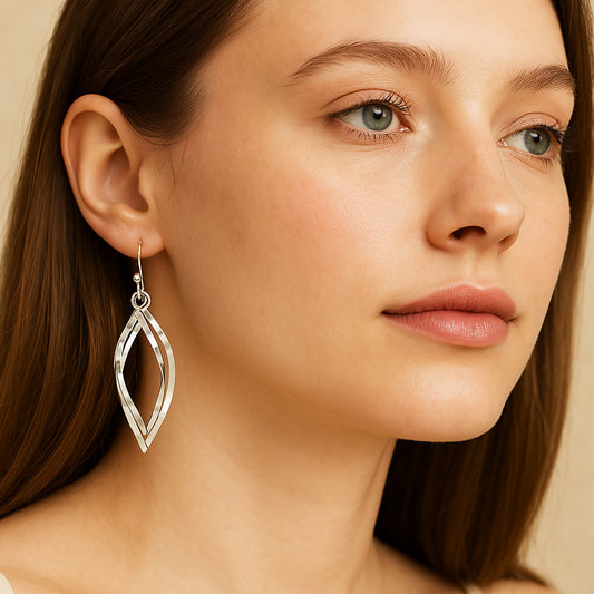 Sterling Silver Triangle Earrings with Openwork and Hammered Oval
